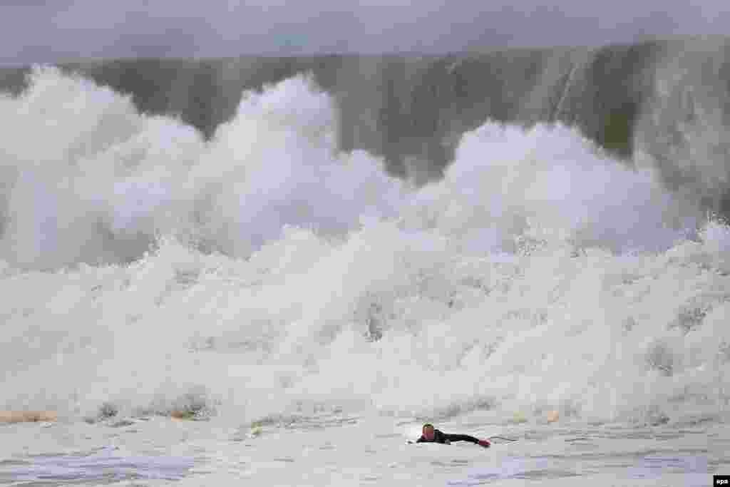 Một người lướt sóng bơi vào bờ trong khi một bức tường sóng khổng lồ ập xuống phía sau tại bãi biển Narrabeen ở khu vực Northern Beaches gần thành phố Sydney, bang New South Wales, Úc.